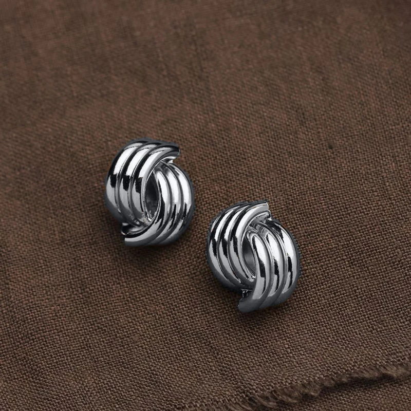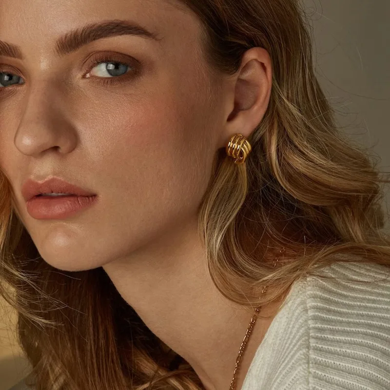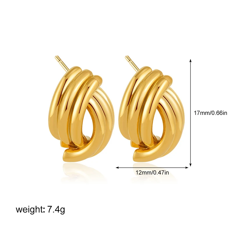 Pendientes de nudo entrelazado de tres capas con textura y acabado brillante para mujer, color dorado, de acero inoxidable. Joyería vintage